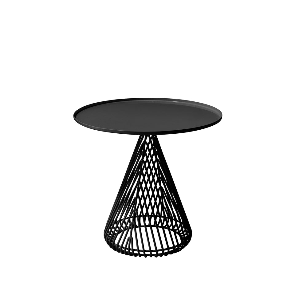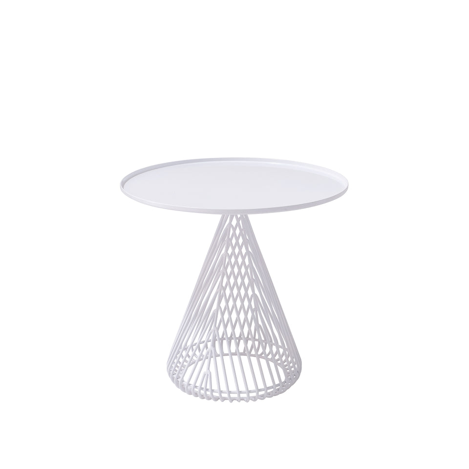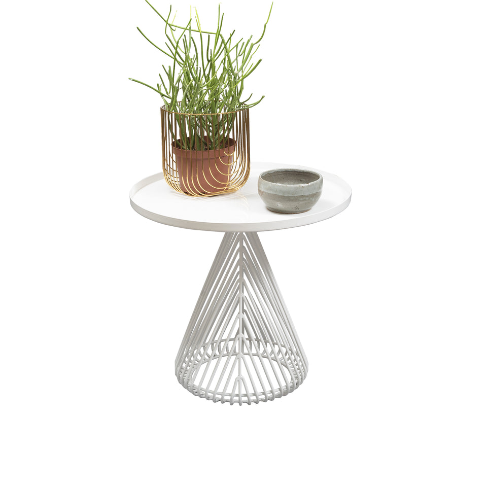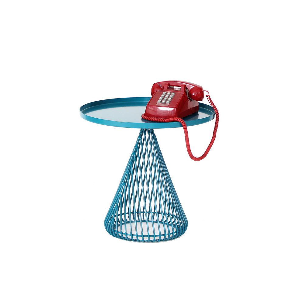 This vintage inspired wire side table is a simple solution for any space. The Cono Table requires no assembly, is light weight, and can be moved easily. The unique lipped metal shape keeps anything from rolling off the table top. The cone base stands out and fits into any modern of contemporary interior design