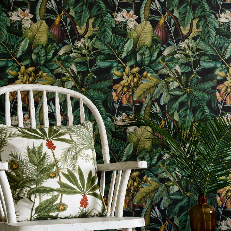This botanical wallpaper is inspired by some of the delicious fruits that can be found in the tropical areas. Specifically, this design is depicting figs and date fruits and beautiful details of the two trees.