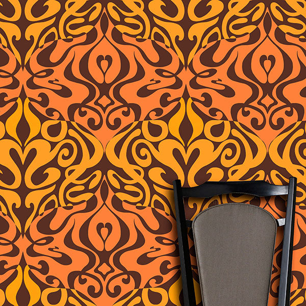 Inspired by the swinging ‘60s, Woodstock wallpaper is presented in psychedelic colours of black on silver foil or aqua on silver, shaded pink on aubergine and peach and ochre on brown. Colours shown on-screen may vary from the original wallpaper, we therefore recommend ordering a sample to view the true colours.