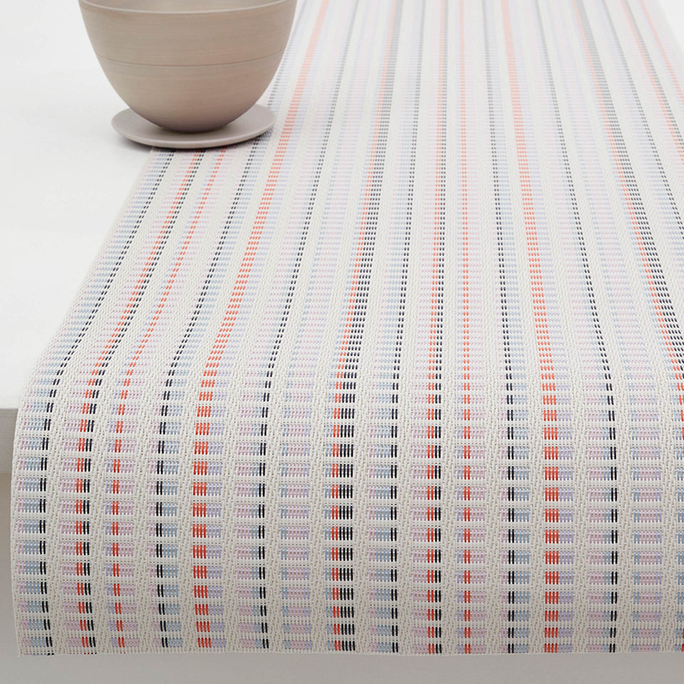 Revealing patterns within patterns and stripes within stripes, Tambour was developed through an iterative process of combining multiple weaves into one harmonious design. It explores novel ways to display vibrant color, balancing the horizontal and the vertical to create a versatile visual rhythm.