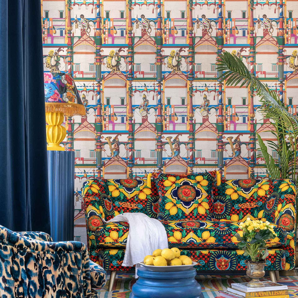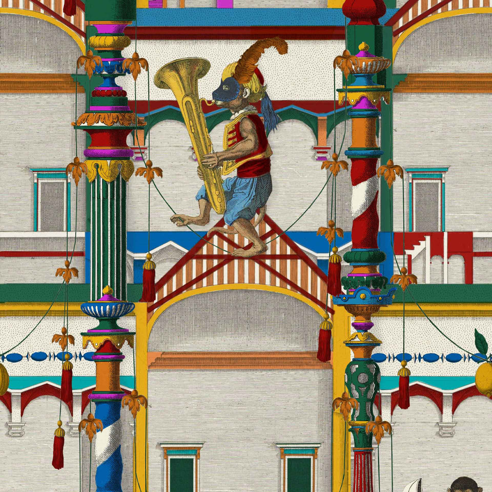 Prepare for an enchanting journey through the labyrinthine alleys of Venice, where every cobblestone whispers tales of mystery and festivity through the carnivale, an ode to the annual extravaganza where masked revelers, reminiscent of the iconic Harlequins, dance amidst the grandeur of centuries-old palazzos. Fine details depict intricate motifs and colorful monkeys, inspired by Venetian masquerade masks, inviting you to lose yourself in a world of timeless celebration and refinement. Let the magic of the moment come alive in your home and transform your space into a sanctuary of joy. Available in two different color backgrounds, light and dark.