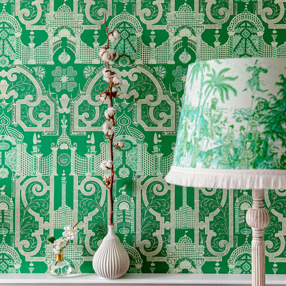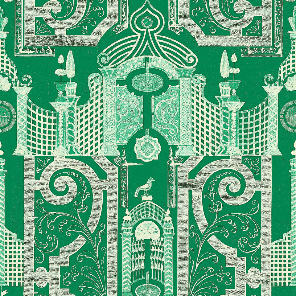 Displaying a captivating, detailed pattern of an old Chinese maze garden, the EMPEROR’S LABYRINTH is a marvelous work of art and a riveting background setting. Inspired by an old drawing created to celebrate the eighteenth-century Imperial gardens, this design praises the uniqueness and perfection of shrubberies and bushes grown on royal grounds. Symbolizing wealth and growth, the deep green shaded layout brings harmony and outdoor soothing vibes to your indoor spaces. Available in a deep green lake monochromatic and bright orange with green color scheme.