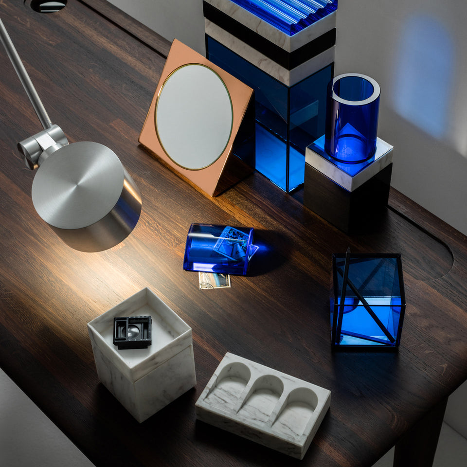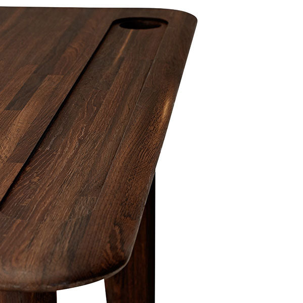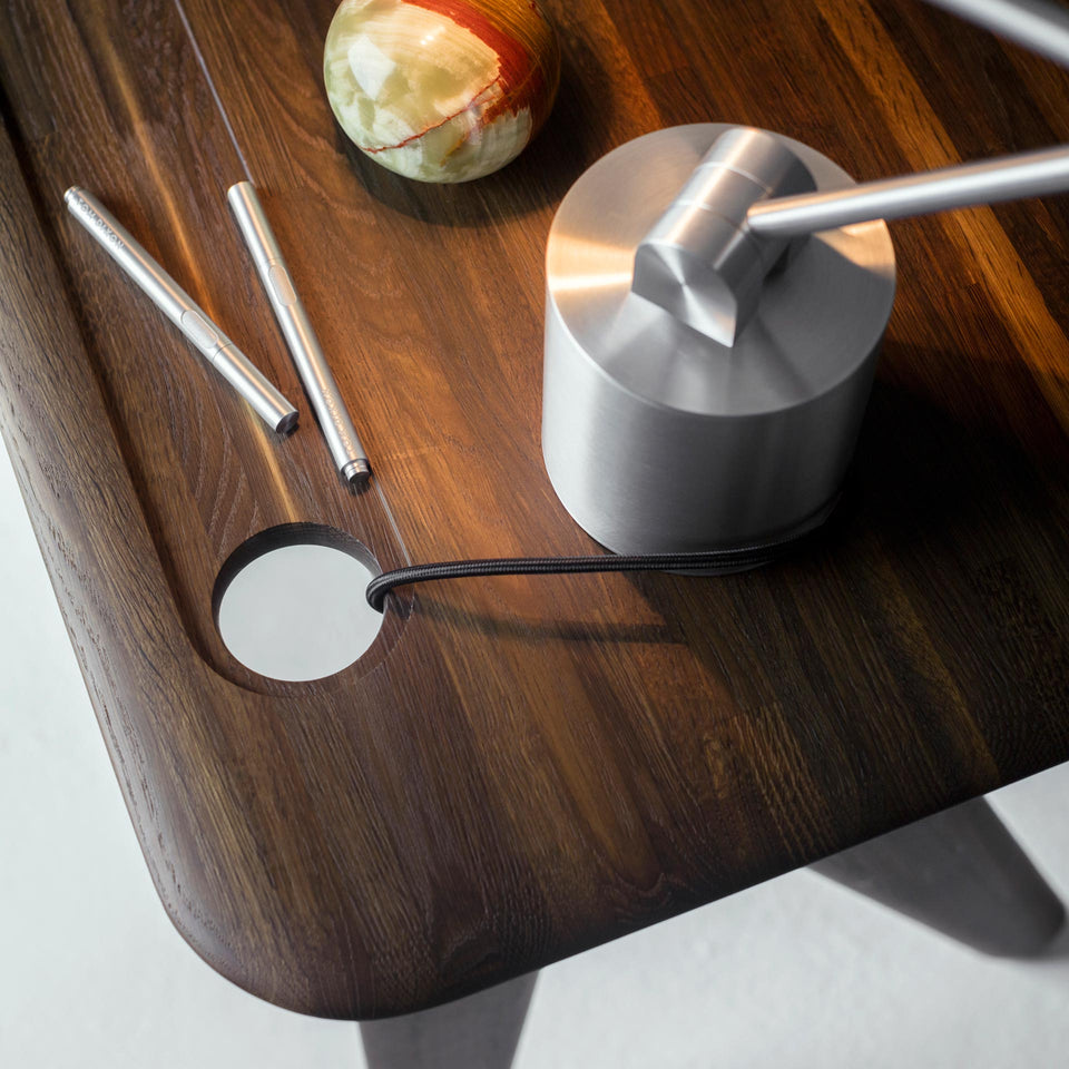 Inspired by the archetypical Victorian school desk, this contemporary work station is equally comfortable as a hotel room desk or a dressing table. Made from solid Oak construction, with softly rounded edges and understated proportions, the traditional inkwell transformed into a cable management hole, and a deeply machined groove for pens and accessories – this desk is a domesticated all situation work station for laptops, for makeup, for sketching or for fiddling around on Instagram.