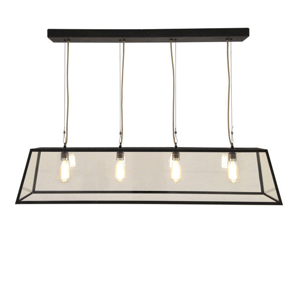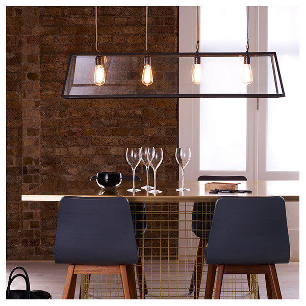 The Diner 125 Pendant has 4 glass sides with the top and bottom open and is suspended with 4 adjustable steel cables. For interior use only.