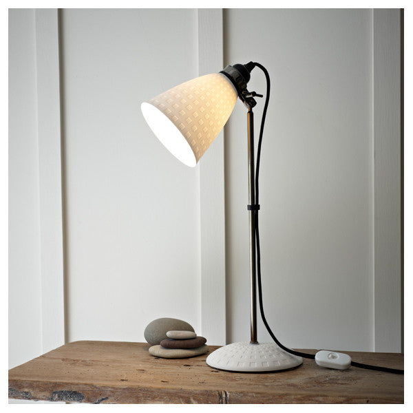 An update of the classic bone china Hector, Original BTC's first design, the Hector 21 features rows of crisply indented graduating squares inspired by the clean lines of the Stoke-on-Trent factory's windows. Slip-cast molded by hand in a highly skilled, labor-intensive process, the shades and bases are smoothed with sponges before biscuit firing to achieve a pure, matte finish. Once complete, the bone china components are sent to the Oxford factory for assembly, matched with a blackened chrome stem and black cotton braided flex for a smart, monochrome finish.