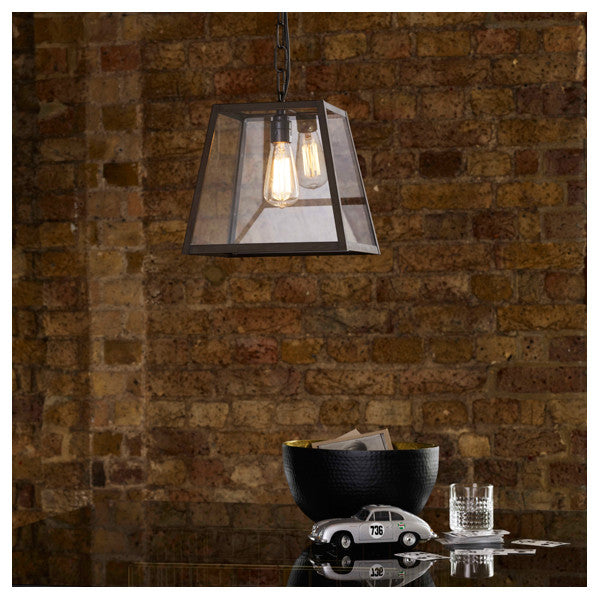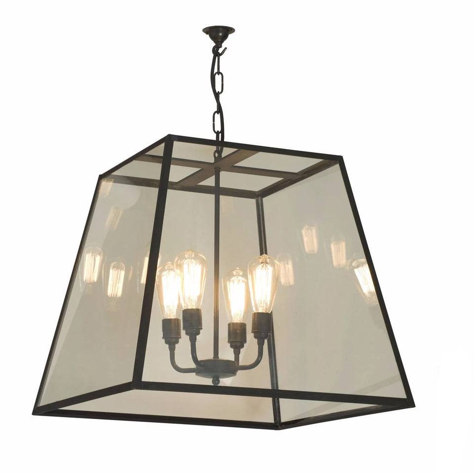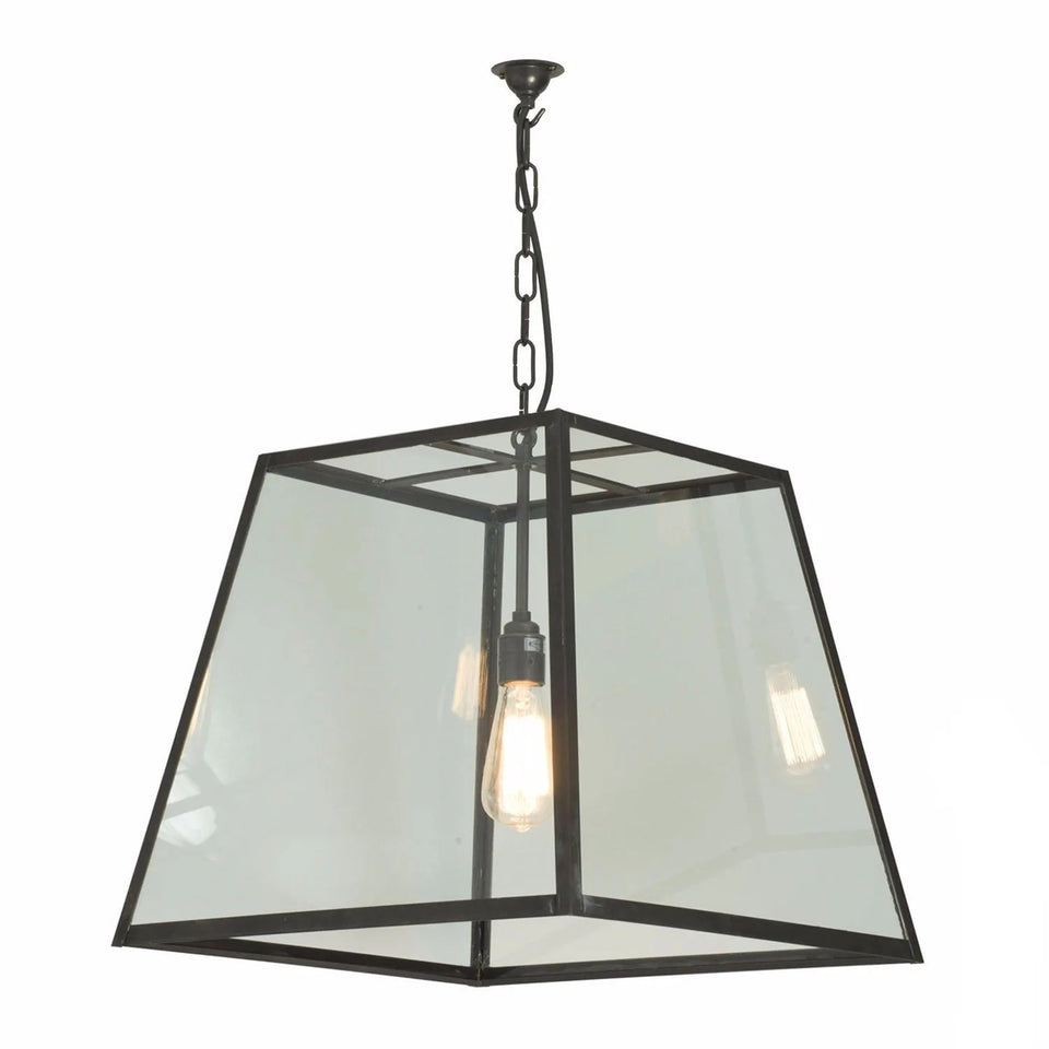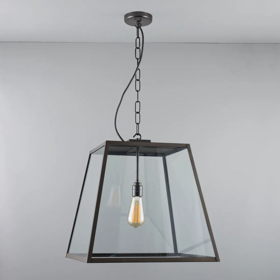 The Quad Pendant Light is a square light with sloping sides, designed with clear glass. With an open base and top, this pendant features a weathered brass finish. Suspended from a coordinating chain flex, it's perfect for creating that industrial look in your interior.