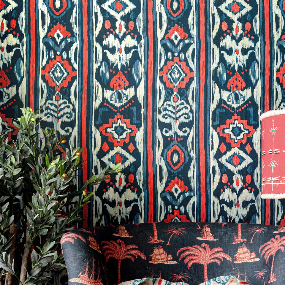 Wavy shades of blue and red dance against a deep indigo background, in an authentic Greek Ikat pattern that manifests local traditions. With big handmade strokes of color, the pattern gives a spectacular visual impact, adding richness and Mediterranean style to any interior.