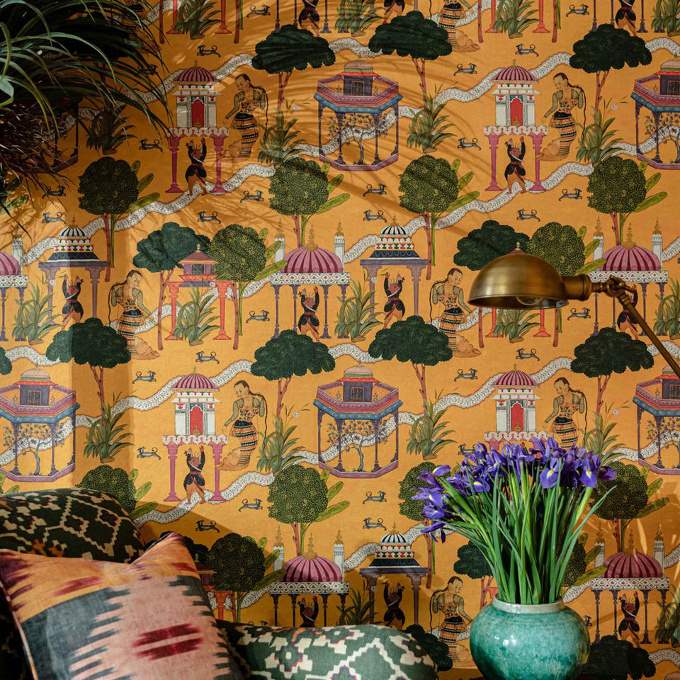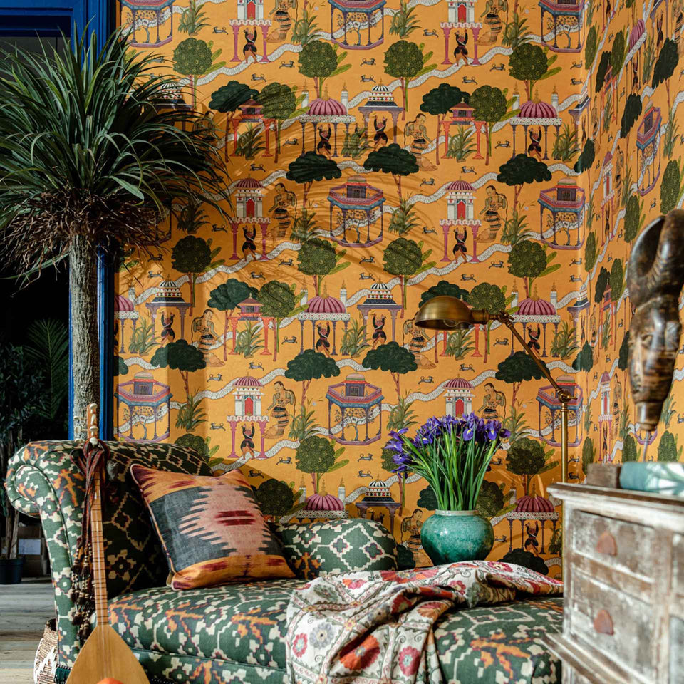 Capturing the essence of the region, the MAGHREB print features embellished architectural structures where mythical dancers perform and small trees take cover from the overhead sunlight. Bold, tiled roofs stand out amongst the sparse shrublands as small animals frolic amongst the desert sand. Fragrant aromas of native flora fill the air with contrasting patterns creating decorative pathways across the earthy-toned backdrop. An energetic print which adds a folkloric charm to the home.