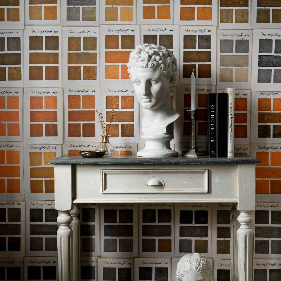 A very special wallpaper design showing pages from what it seems to be the first book of colours created by A. Boogert in 1692. A one-of-a-kind design with a wide range of colour swatches hand drawn with aqua tint. Available in two versions: warm tones and greys. The design is printed over 3 rolls.