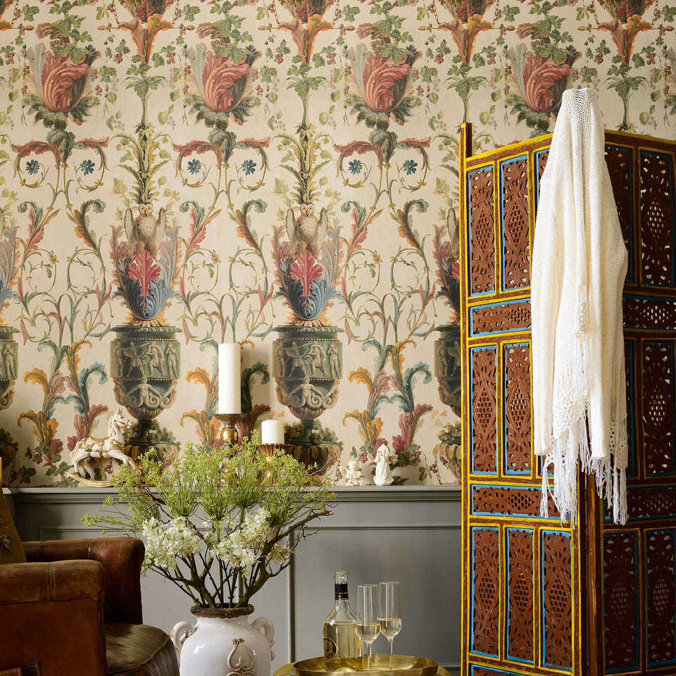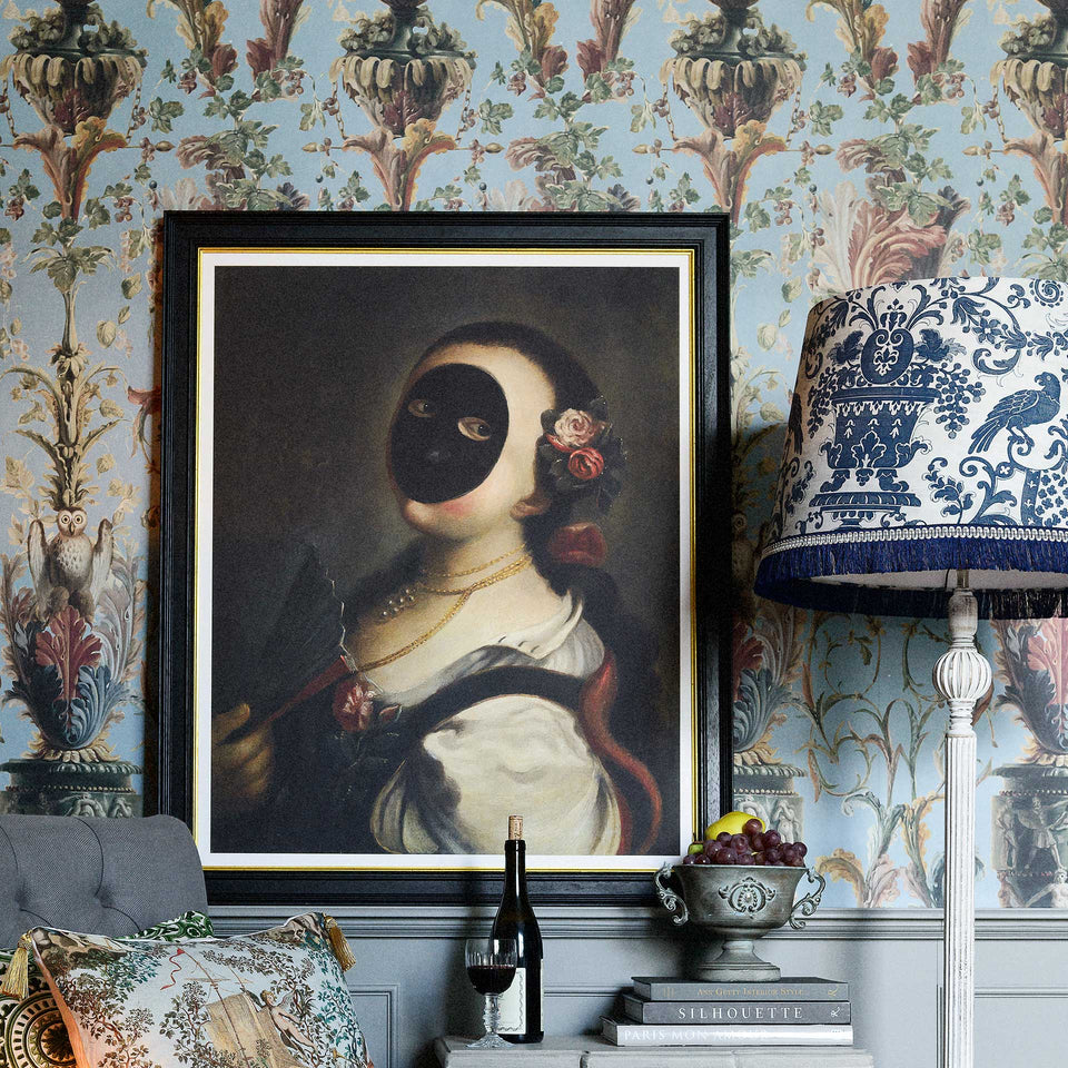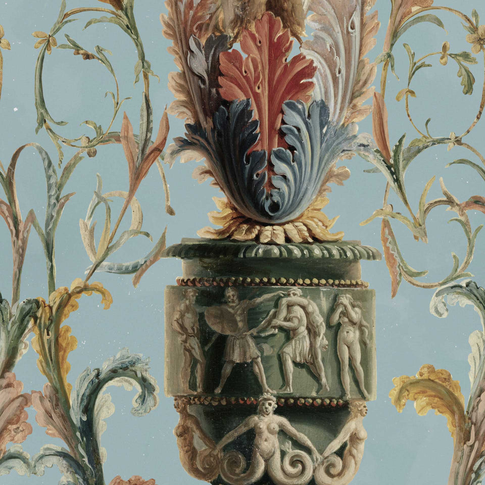 A sumptuous panel style wallpaper featuring decorative and grotesque oil painted elements from the house of a Dutch nobleman. Inspired by Renaissance art, the wallpaper sows beautiful decorative motifs on a light blue or taupe background.