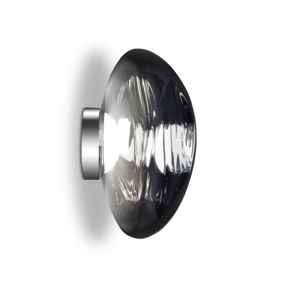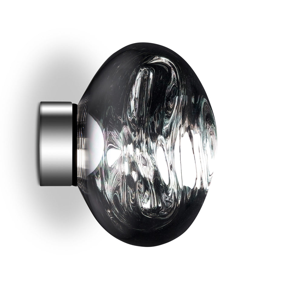 Melt is a beautifully distorted surface light in a modern finish. Featuring our integrated LED module, this Tom Dixon wall light creates a mesmerizing melting hot-blown glass effect when on and a mirror-finish effect when off. It is made in Germany using a high tech manufacturing technique to achieve a perfect melted orb.