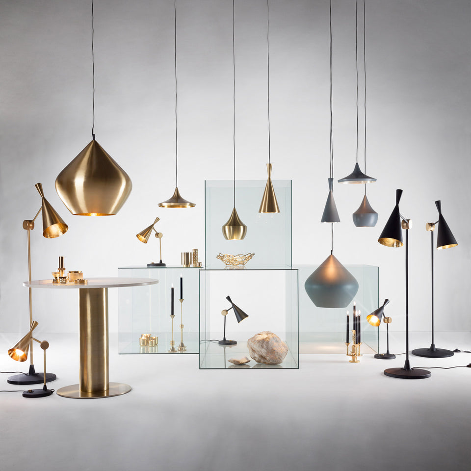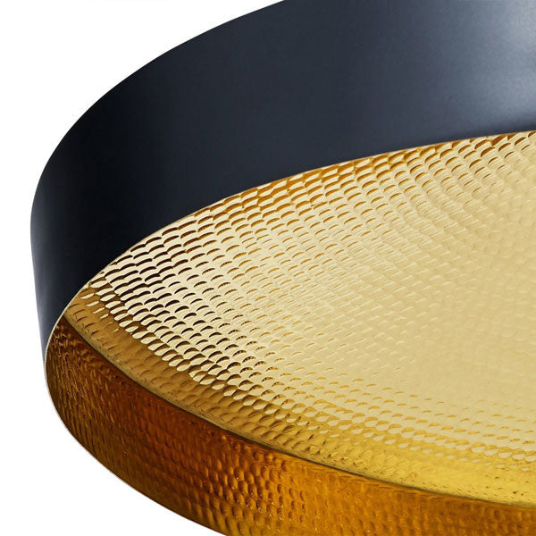 The Beat Light Collection pulled its inspiration from traditional Indian cooking pots and water vessels. Tom Dixon works closely with skilled artisans in Moradabad in Northern India, using rapidly vanishing skills learned from ancient Indian craftsmen, to create these beautiful fixtures. The Beat brass shades are formed by hand through spinning and beating technics making each shape unique. The interior is finished in a lacquer to prevent oxidation. The exterior is painted matte black. Beat Flat boasts a fresh silhouette and gives off a greater light output.