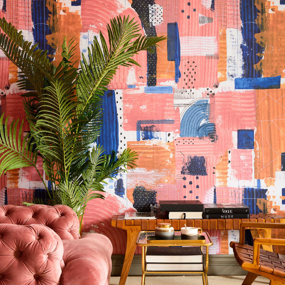 An original abstract style wallpaper. Mixing the pink, dark blue and pale brownish in sweet but bitter shades with contrasting graphic elements like brush strokes, lines and dots, makes this wallpaper a strong and faithful interpretation of the glamorous 60’s. The design is printed over 3 panels.