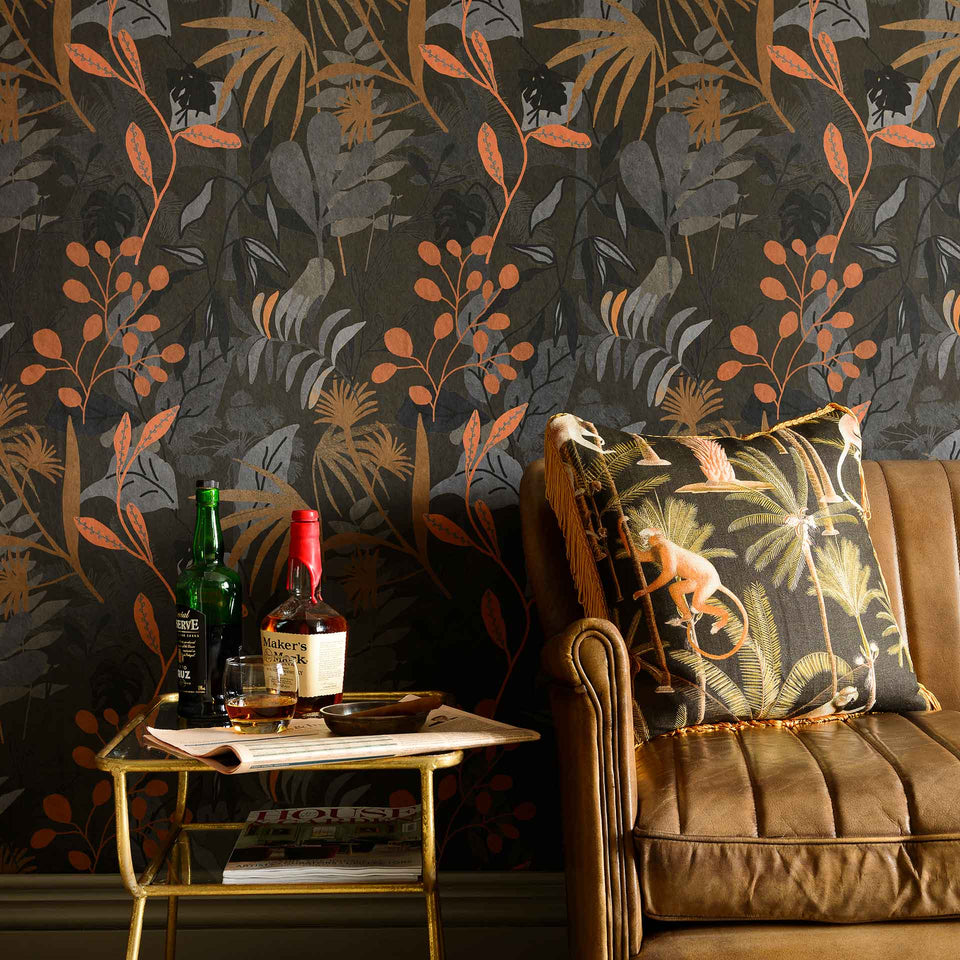 A moody tropical inspiration wallpaper with large scale foliage elements on a dark background.