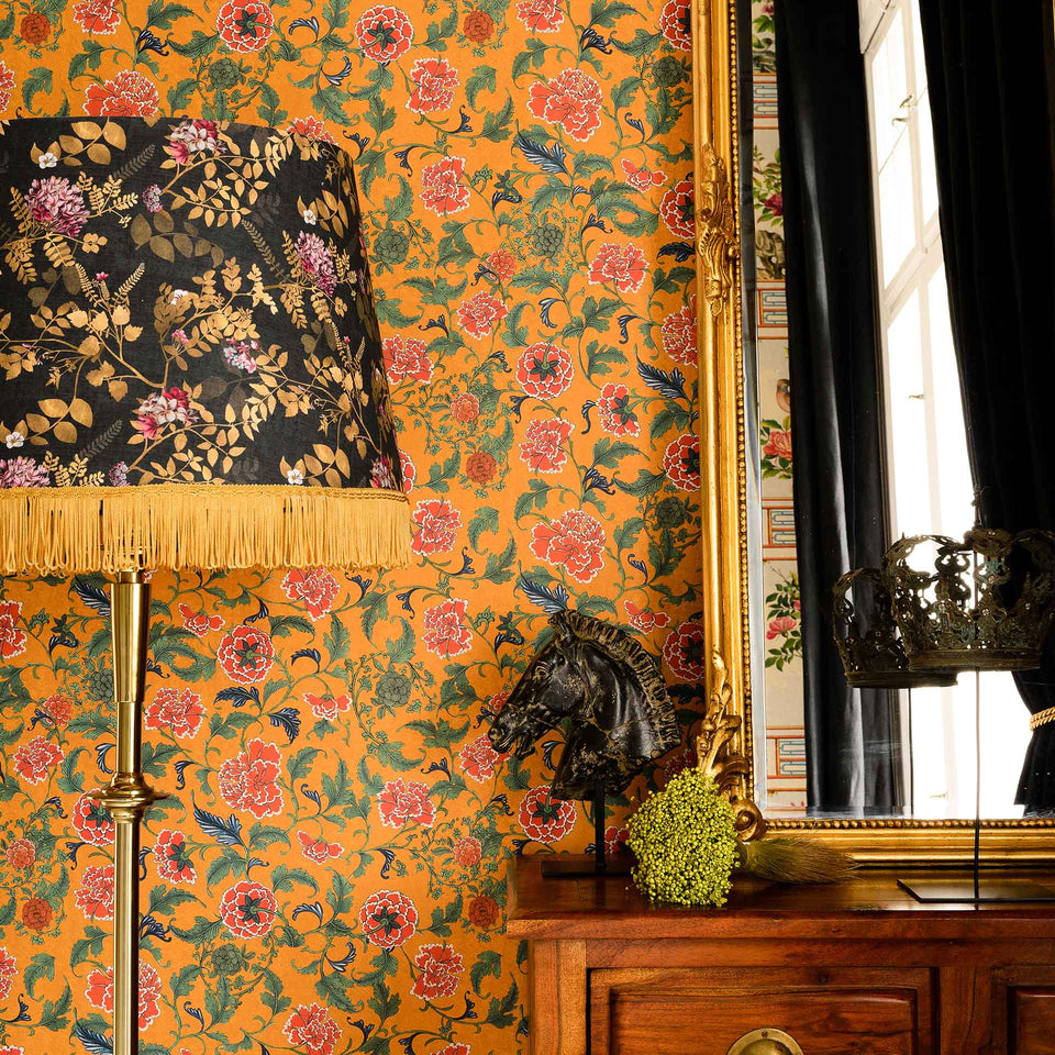 With soft and warm flowery details, the CHINESE ORNAMENT wallpaper has a powerful visual impact, while unveiling its delicate character. Intricate details bring charm to the orange and green ambiance, as rich golden tones add glamour and sophistication. Easy to be used in any interiors to cheer up your walls and to add some floral inspiration to your home.