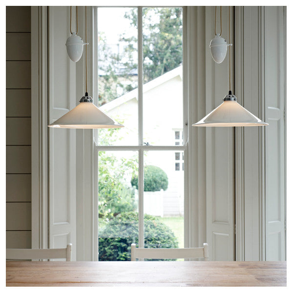 Traditionally inspired with a modern twist, rise and fall pendants allow you to adjust height and vary lighting effects, making them the ideal choice for dining tables and kitchens. Simply lower the light for intimate dinners or raise for a broader pool of general light. The fine bone china is very attractive unlit and gives a wonderful ambient light when illuminated. The shades are slipped cast and hand-finished by skilled craftsmen.