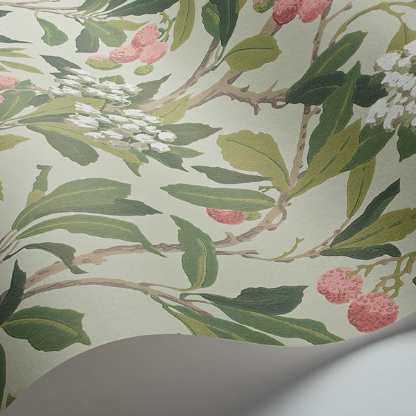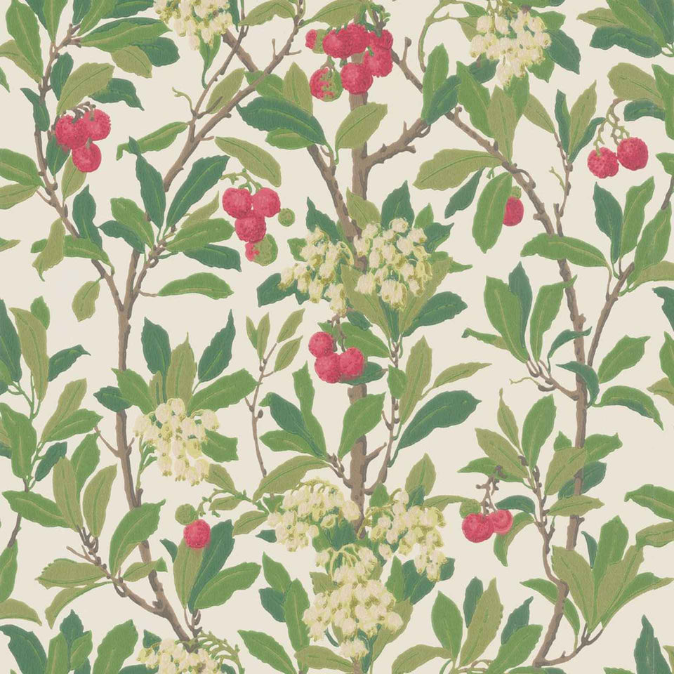 A stunning block printed design from the Jeffrey & Co. archives reproduced here as a classic surface printed wallpaper. Available in three opulent colour-ways of pink and khaki, scarlet and green and pink and linen, this wonderful old print blends an arts and crafts ancestry with a classical twist to produce a truly majestic wallpaper.