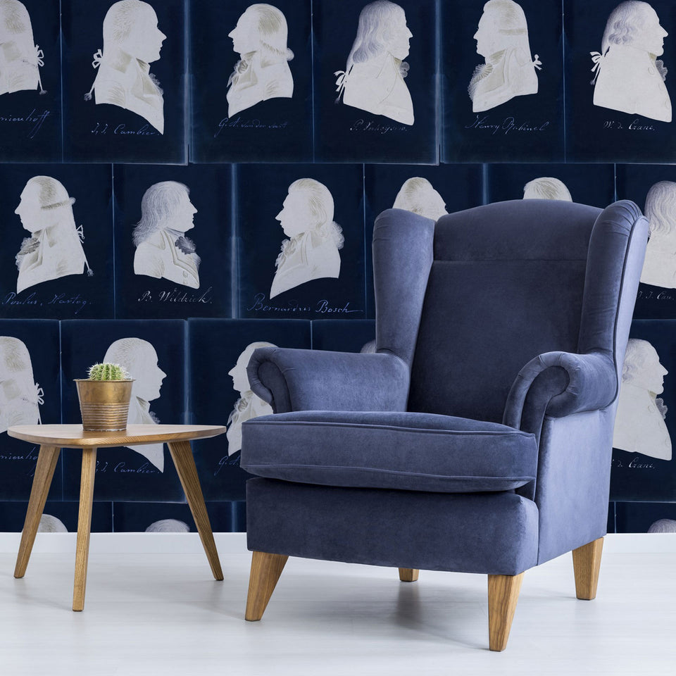 An interesting wallpaper, featuring a collection of vintage portraits of famous dutch people, on a white background. The design is printed over 3 rolls.