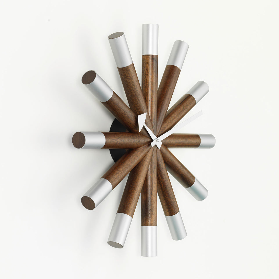 The "Wheel" clock was designed by George Nelson in the early 1960's and is an icon of modern design. Manufactured by Vitra in Europe, this clock is battery powered by 1 AA battery (included) and has a quartz driven mechanism.