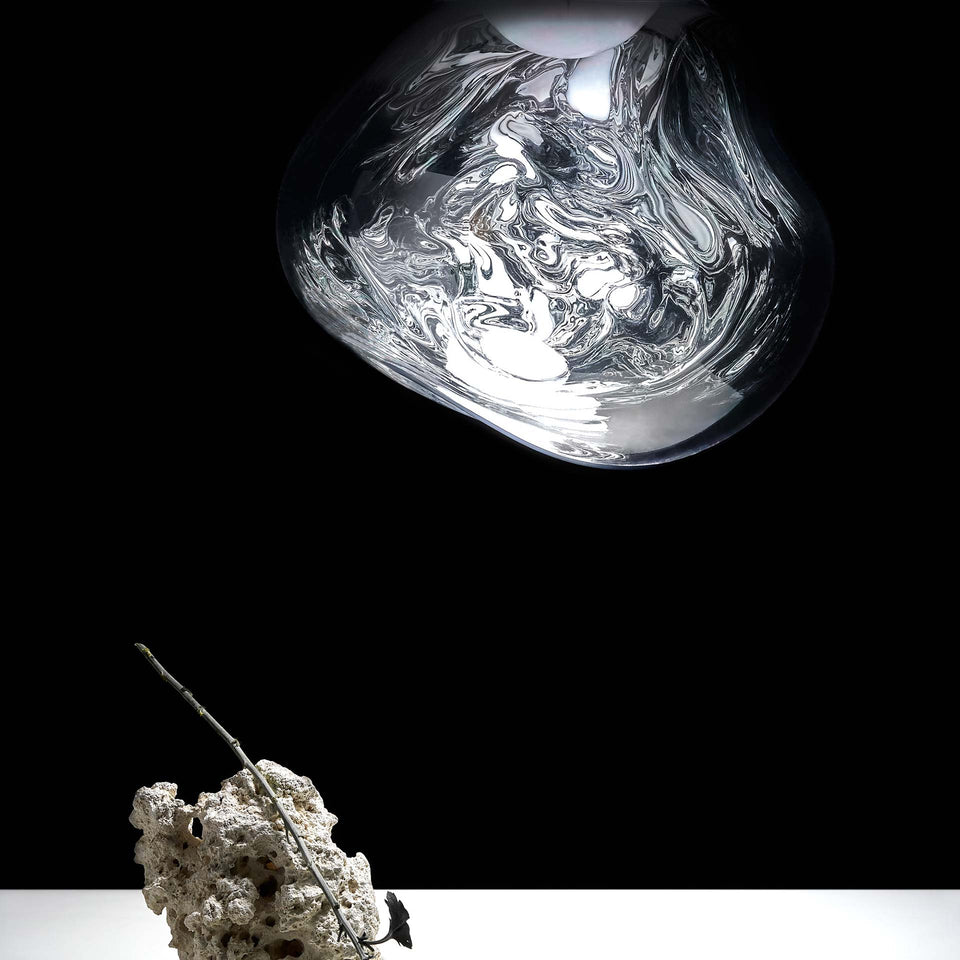 Melt is a beautifully distorted pendant in a modern smoke finish and chrome top and ceiling rose. Featuring Tom Dixon's intergrated LED module, this pendant light creates a mesmirizing melting hot-blown glass effect when on and a mirror-finish effect when off. Made in Germany using a high tech manufacturing technique to achieve the perfect melted orb.