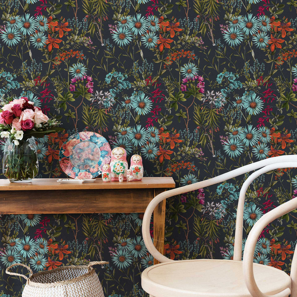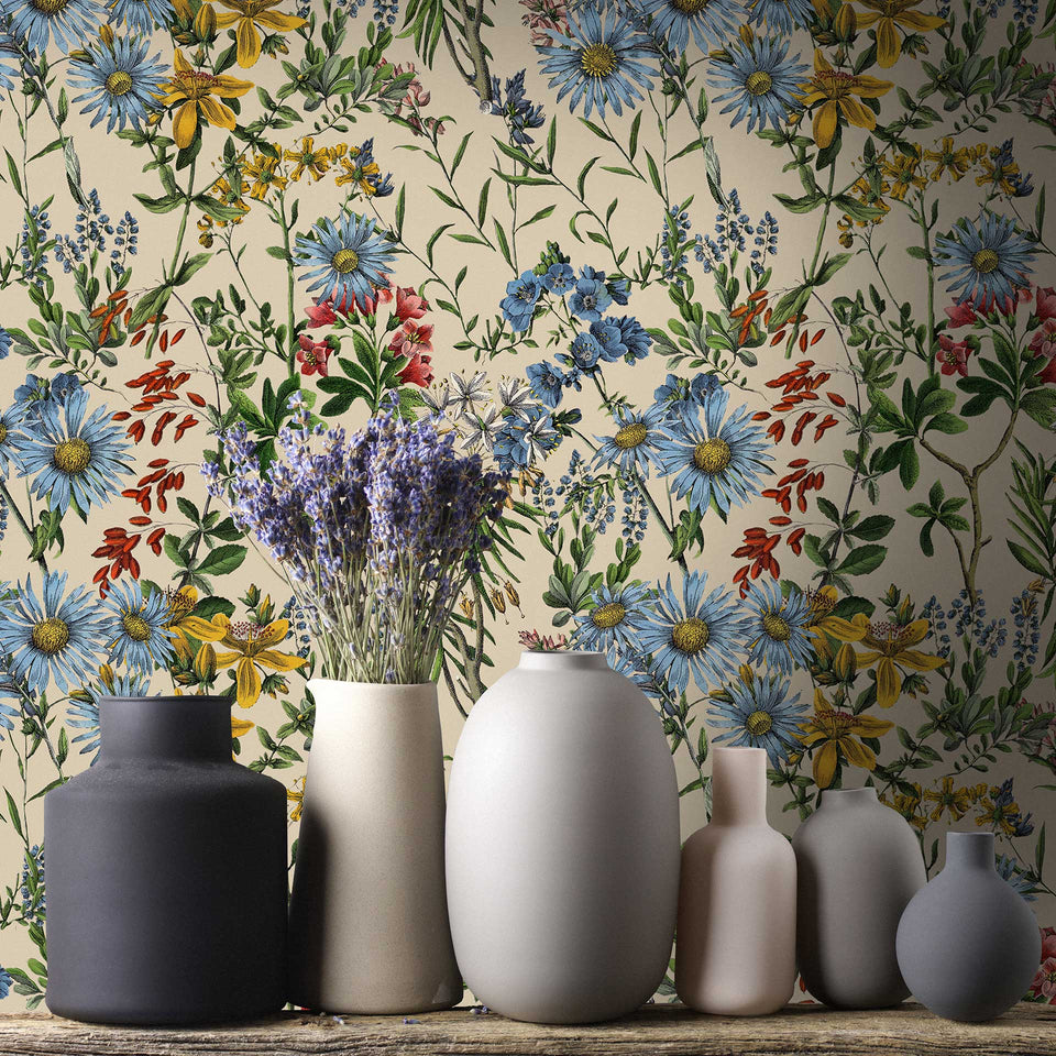 An impressive floral wallpaper with summerish colors, that brings warmth and happiness in every interior.