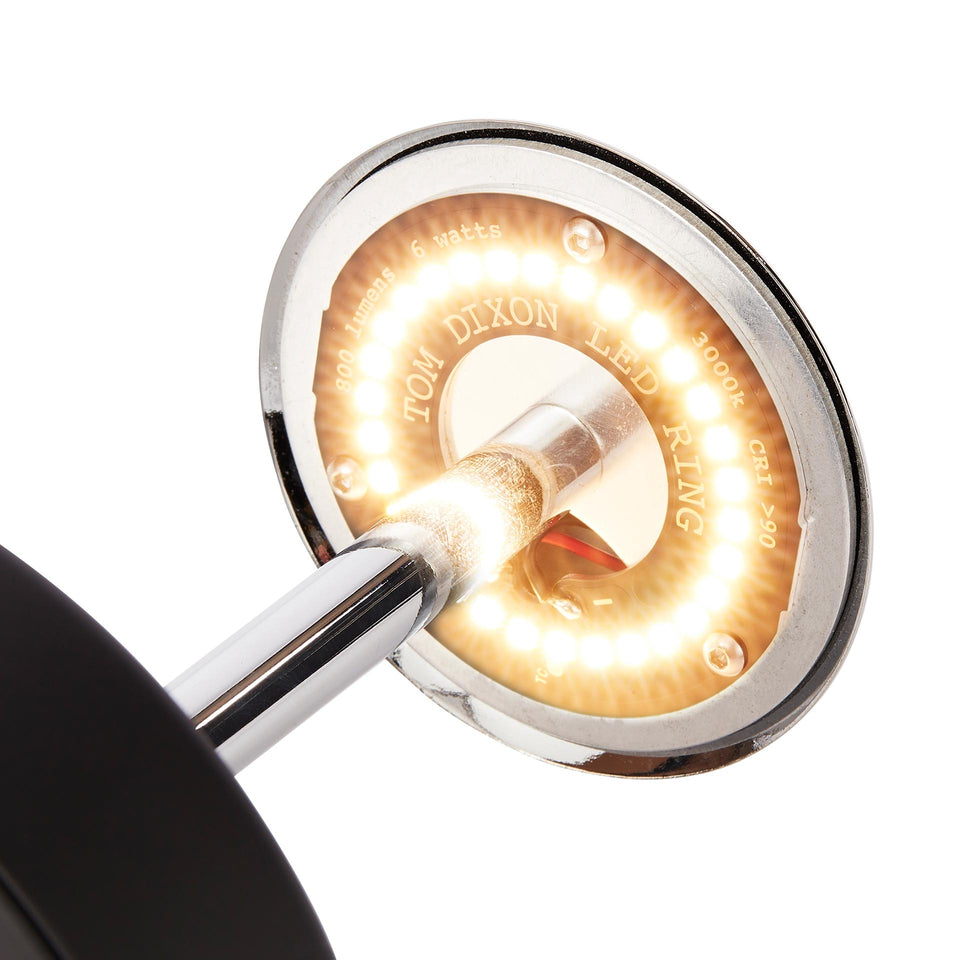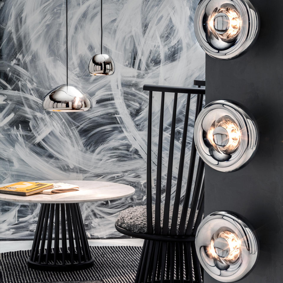 The process of creating Void is complex. Cut from a sheet of pure metal, each light is pressed and spun, then brazed at the end to form a double-walled shade. The high-shine reflectivity achieved with lathing, polishing and caring for base metals is a bold finish that carries across Void.