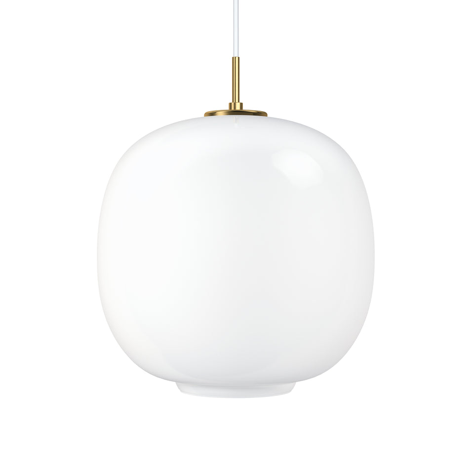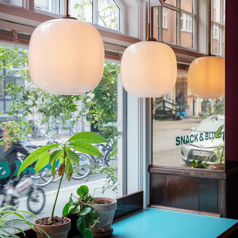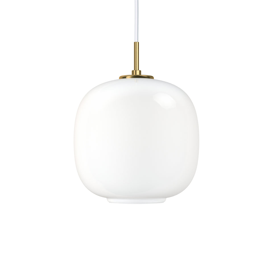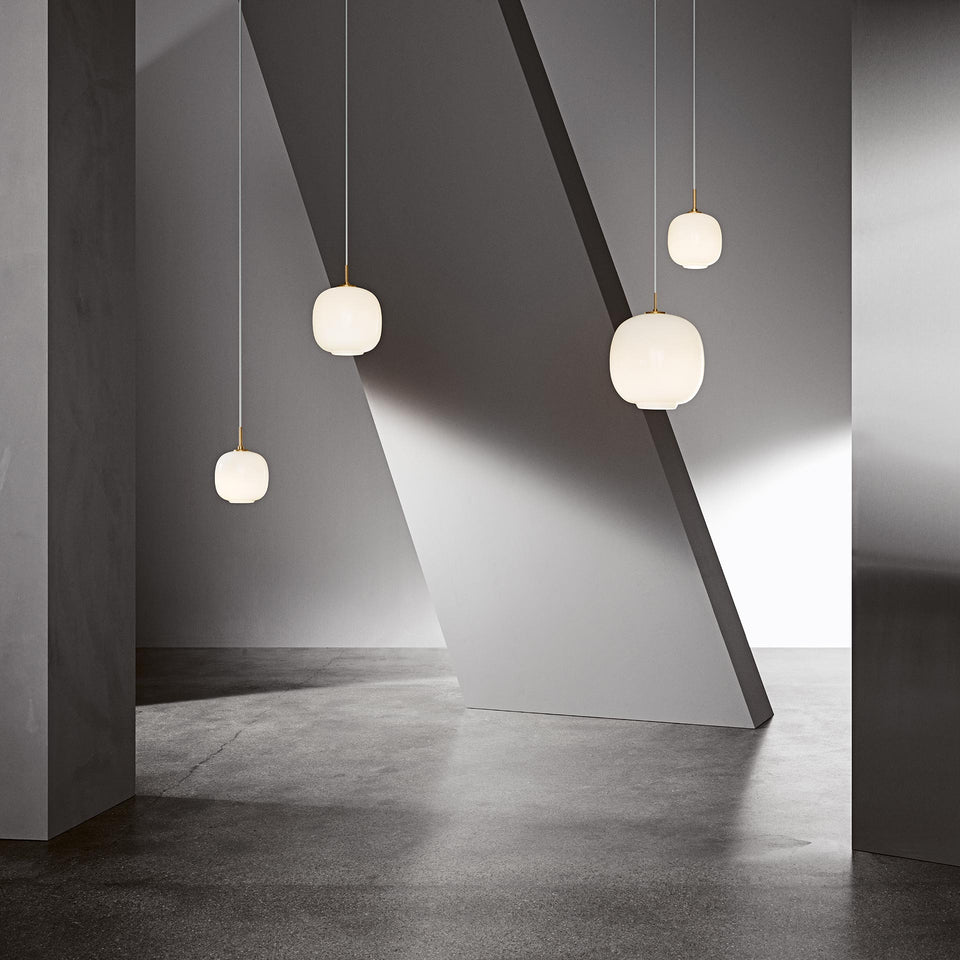In 2016 the Radiohus Pendant made a comeback under the name of VL45 Radiohus Pendant. It was originally designed in the 1940s by Danish architect Vilhelm Lauritzen in partnership with Louis Poulsen for the construction of the Radiohuset building (the Danish broadcasting house) in Copenhagen. The pendant features the original design, with a brass suspension as well as a shade of three layers of handblown glass. The innermost and outermost layers are made of transparent polished glass, while white glass is used for the intermediate layer.